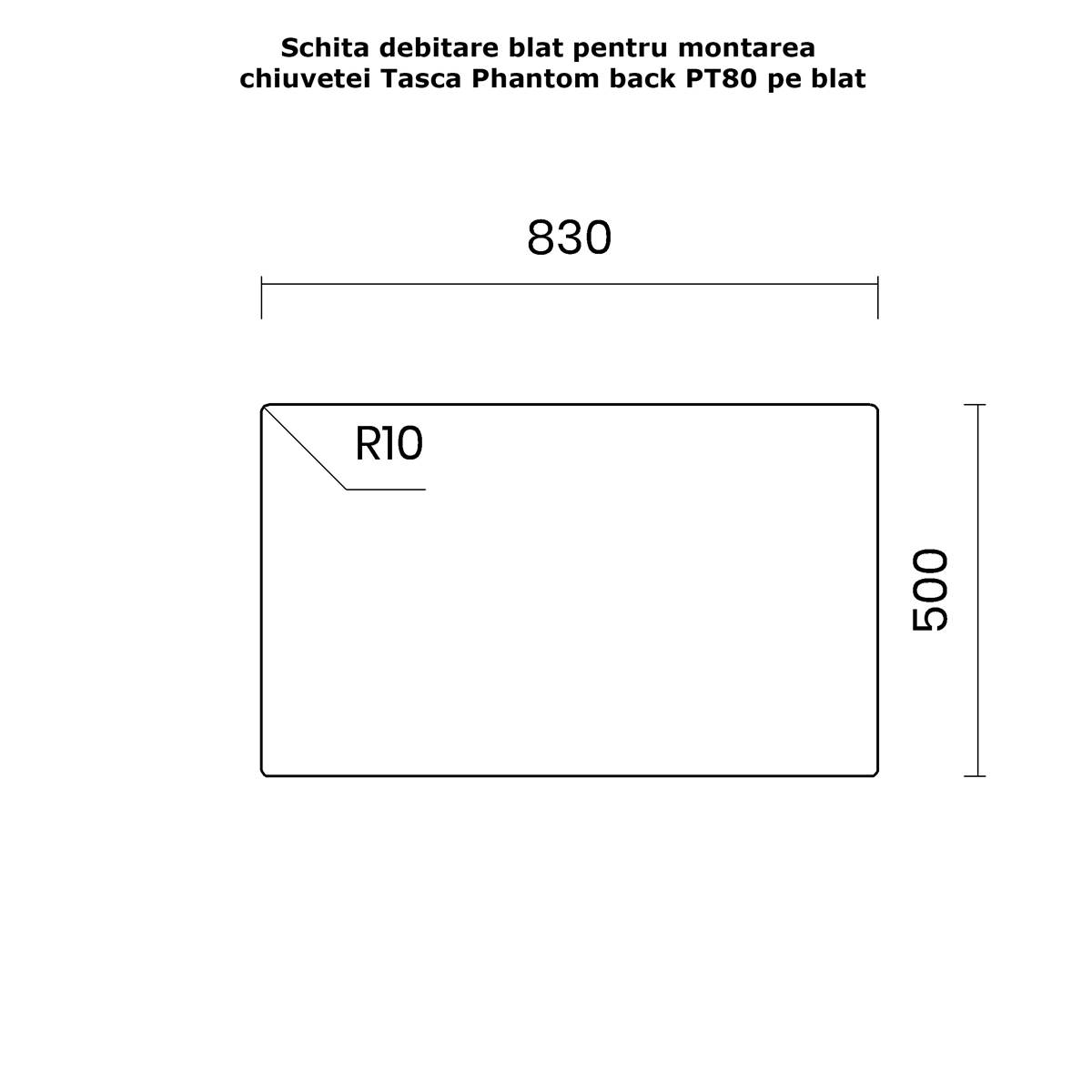 Decupajul necesar in blatul de bucatarie in cazul in care chiuveta se monteaza pe blat (montaj numit si topmount sau overmount) este de 830mm / 500mm (vezi schita detaliata la poze produs) cu colturi cu raza R10, dar recomandam taierea blatului doar in momentul in care ati primit chiuveta.