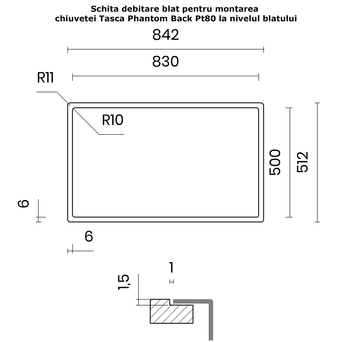 Decupajul necesar in blatul de bucatarie in cazul in care chiuveta se monteaza la nivelul blatului (montaj numit si incastrat, ingropat, flush mount sau filotop) este de 830mm / 500mm cu colturi cu raza R10, cu un sanfren aditional in grosime de 1.5mm din blat perimetral pentru a acomoda/ascunde marginea chiuvetei astfel chenarul acestui sanfren va fi de 842mm / 512mm cu o raza de curbura la colturi R11 (vezi schita detaliata la poze produs), dar recomandam taierea blatului doar in momentul in care ati primit chiuveta. Aceste informatii impreuna cu schita din prezentarea produsului sunt recomandate a se comunica firmei care debiteaza si realizeaza sanfrenul pe CNC pentru blatul de granit/compozit/HPL/HPC sau alt material rezistent la apa.