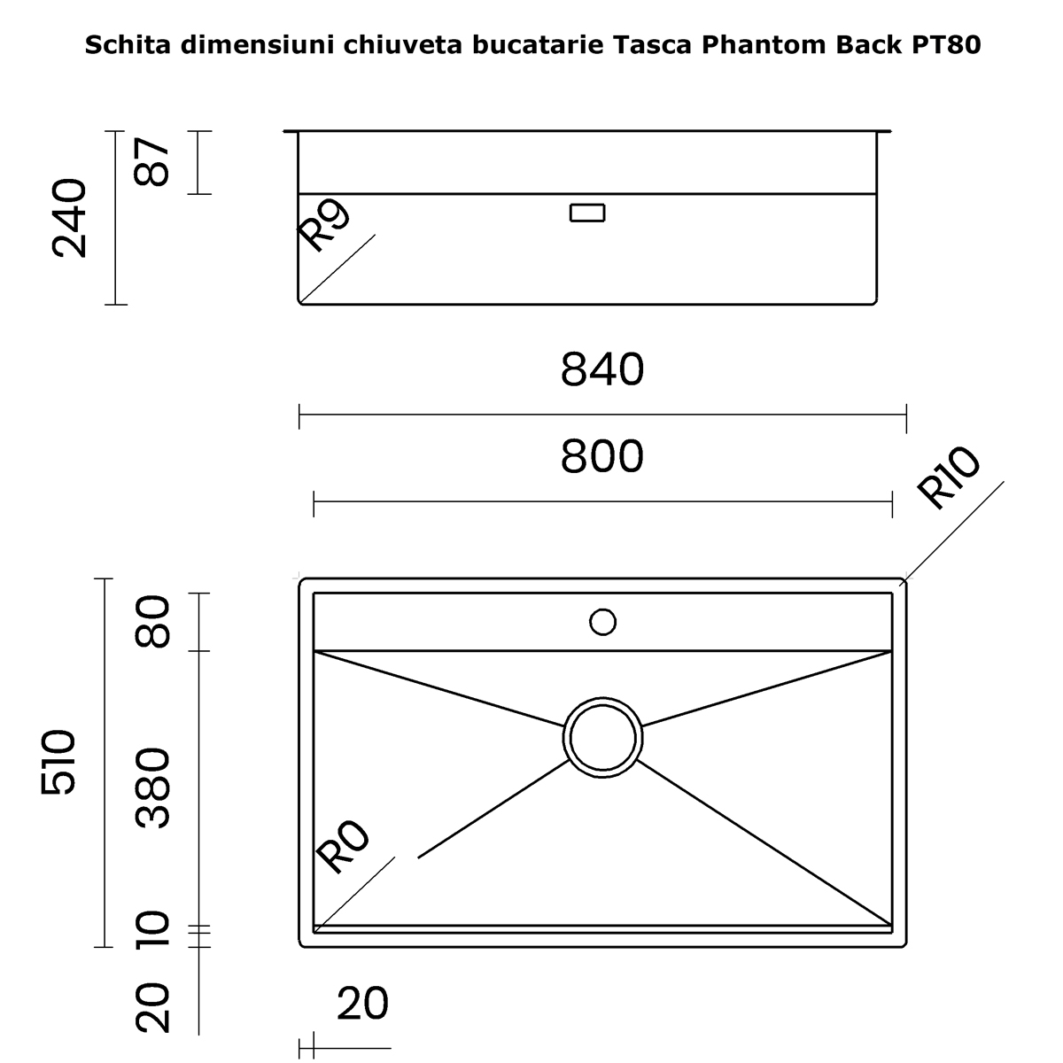 Chiuveta Phantom Back PT80 este sudata din otel inoxidabil satinat 18/10 (SUS304) si este proiectata cu un ventil de scurgere rotund cu un diametru de 114mm si gaura de montaj a ventilui de 90mm, cu inchidere si deschidere prin apasare/ridicare, ideala pentru bucatarii mari sau medii, unde se doreste atat eficientizarea spatiului cat si un aspect mai futurist. Chiuveta are raze de curbura la colturile verticale ale cuvei R0 (de 0mm) iar colturile orizontale de pe fundul cuvei au raza de curbura R9 (de 9mm), acolo unde este necesara o oarecare curbura pentru o curatare mai usoara a cuvei.