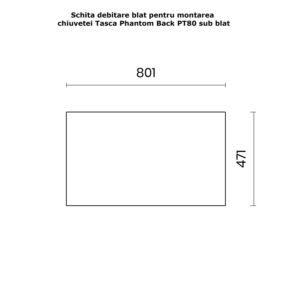 Decupajul necesar in blatul de bucatarie in cazul in care chiuveta se monteaza sub blat (montaj numit si undermount sau underworktop) este de 801mm / 471mm cu colturi cu raza R0, dar recomandam taierea blatului doar in momentul in care ati primit chiuveta.