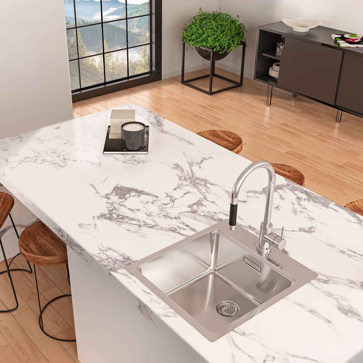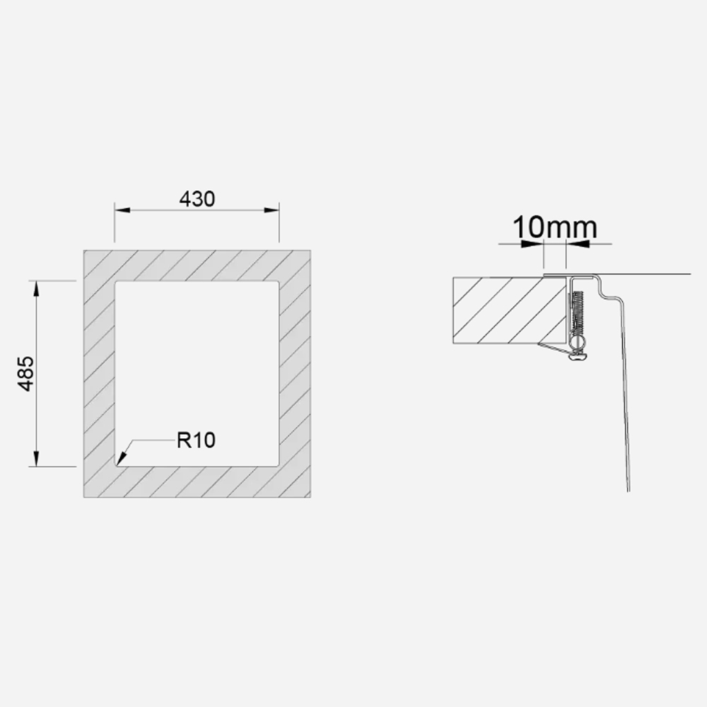 Decupajul necesar in blatul de bucatarie in cazul in care chiuveta se monteaza pe blat este de 430mm / 485mm, dar recomandam taierea blatului doar in momentul in care ati primit chiuveta. Corpul de mobilier pentru chiuveta de bucatarie recomandat de producator este de minim 500mm lungime.