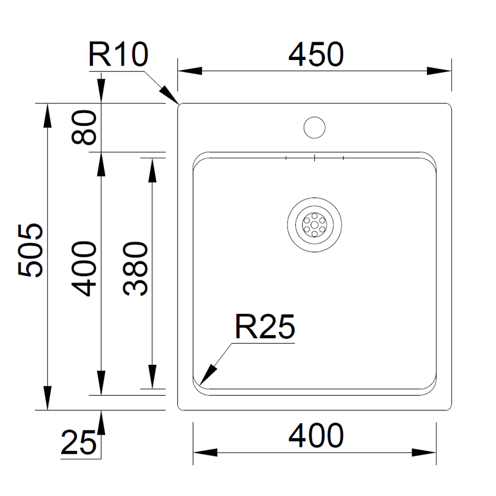Dimensiunea exterioara a chiuvetei este de 450mm lungime / 505mm latime / 200mm inaltime.