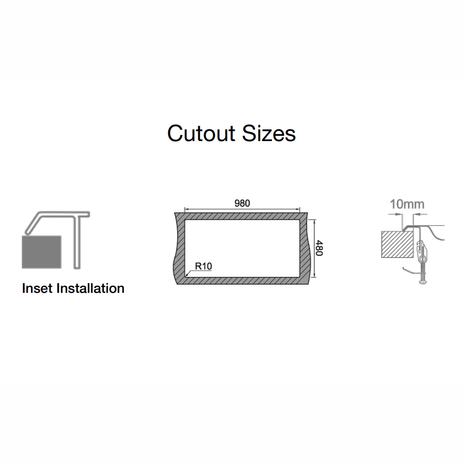Decupajul necesar in blatul de bucatarie pentru montarea chiuvetei pe blat este de 980mm / 480mm, dar recomandam taierea blatului doar in momentul in care ati primit chiuveta. Corpul de mobilier pentru chiuveta de bucatarie recomandat de producator este de 600mm lungime.