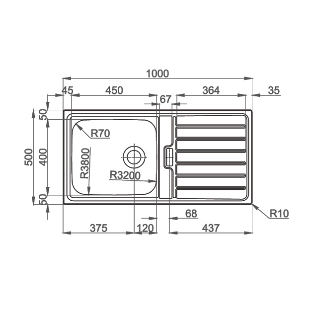 Dimensiunea exterioara a chiuvetei este de 1000mm lungime / 500mm latime / 200mm inaltime.