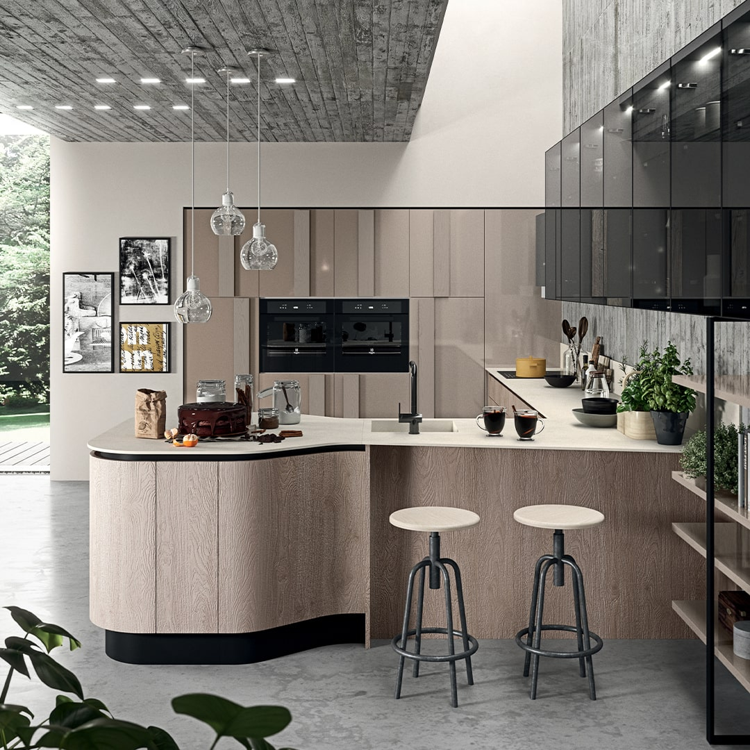 Estetica modelului este pusa in valoare prin linii curate, uneori rotunjite, care adauga un plus de eleganta si confort vizual. In anumite configuratii, formele curbate ale insulelor si peninsulelor creeaza o atmosfera primitoare, sofisticata si echilibrata, fara a compromite functionalitatea.