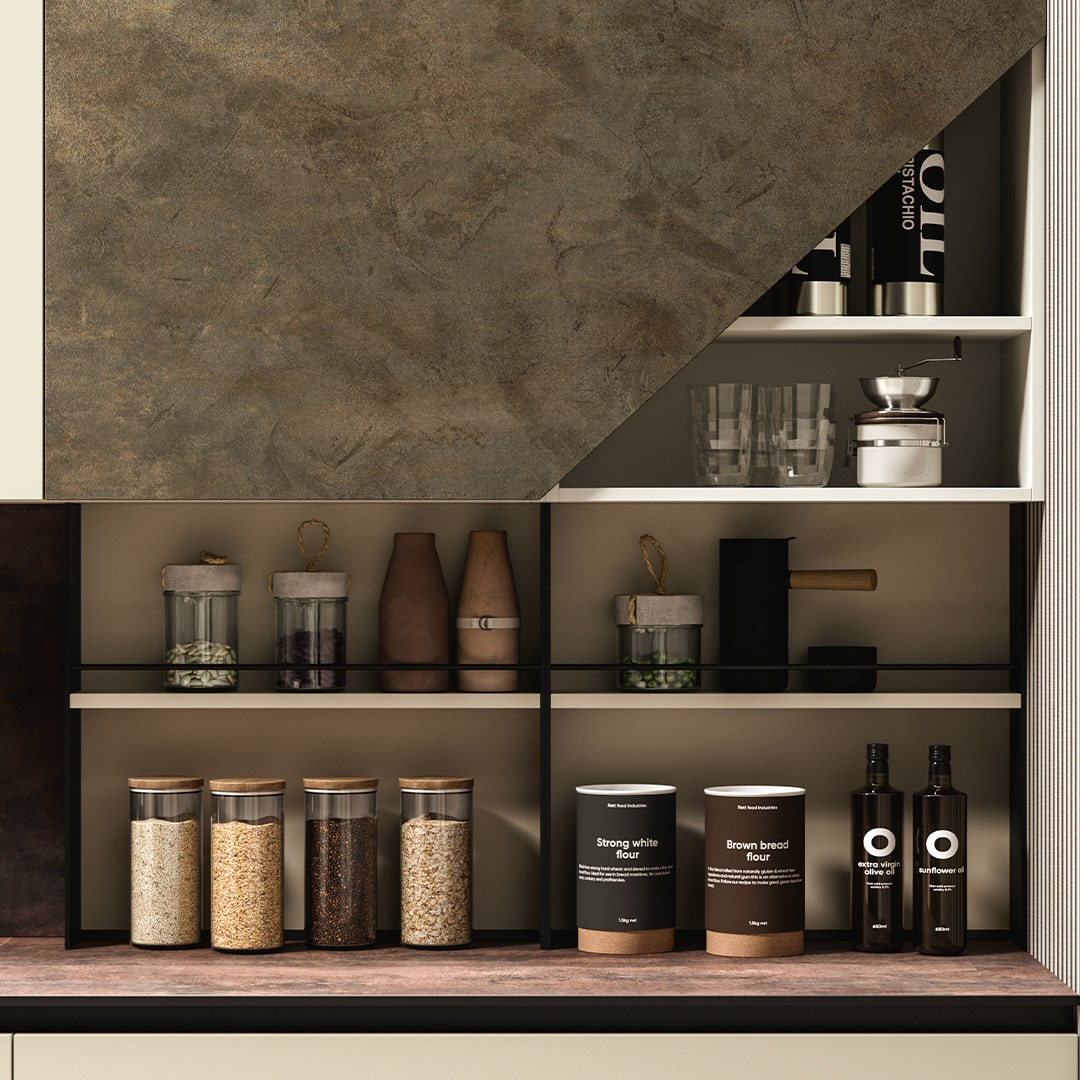 Colectia este ideala pentru spatii open-space, integrand armonios bucataria cu zona de living prin biblioteci, module deschise si sisteme verticale care creeaza continuitate vizuala. Iluminarea integrata, combinatia dintre plin si gol si varietatea mare de finisaje transforma MIA intr-o bucatarie moderna, practica si extrem de expresiva.