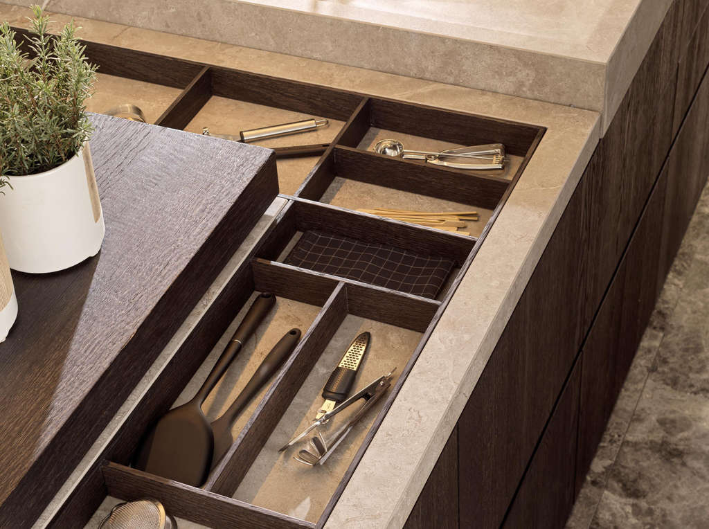 Zona de bar adauga o componenta sociala prin deschiderea sa diagonala, iar blatul mobil integreaza solutii inteligente de depozitare, astfel incat totul sa fie organizat eficient si usor accesibil.