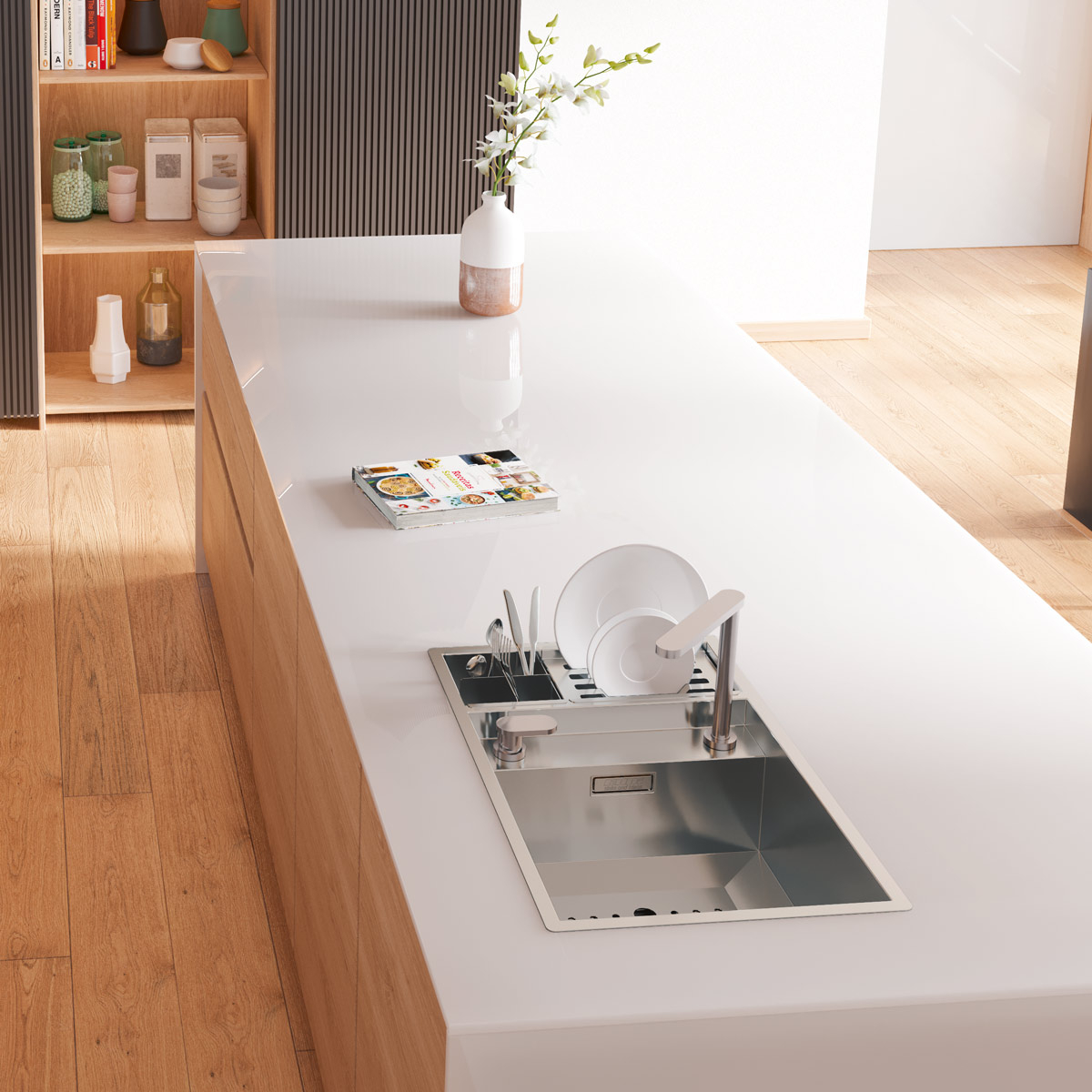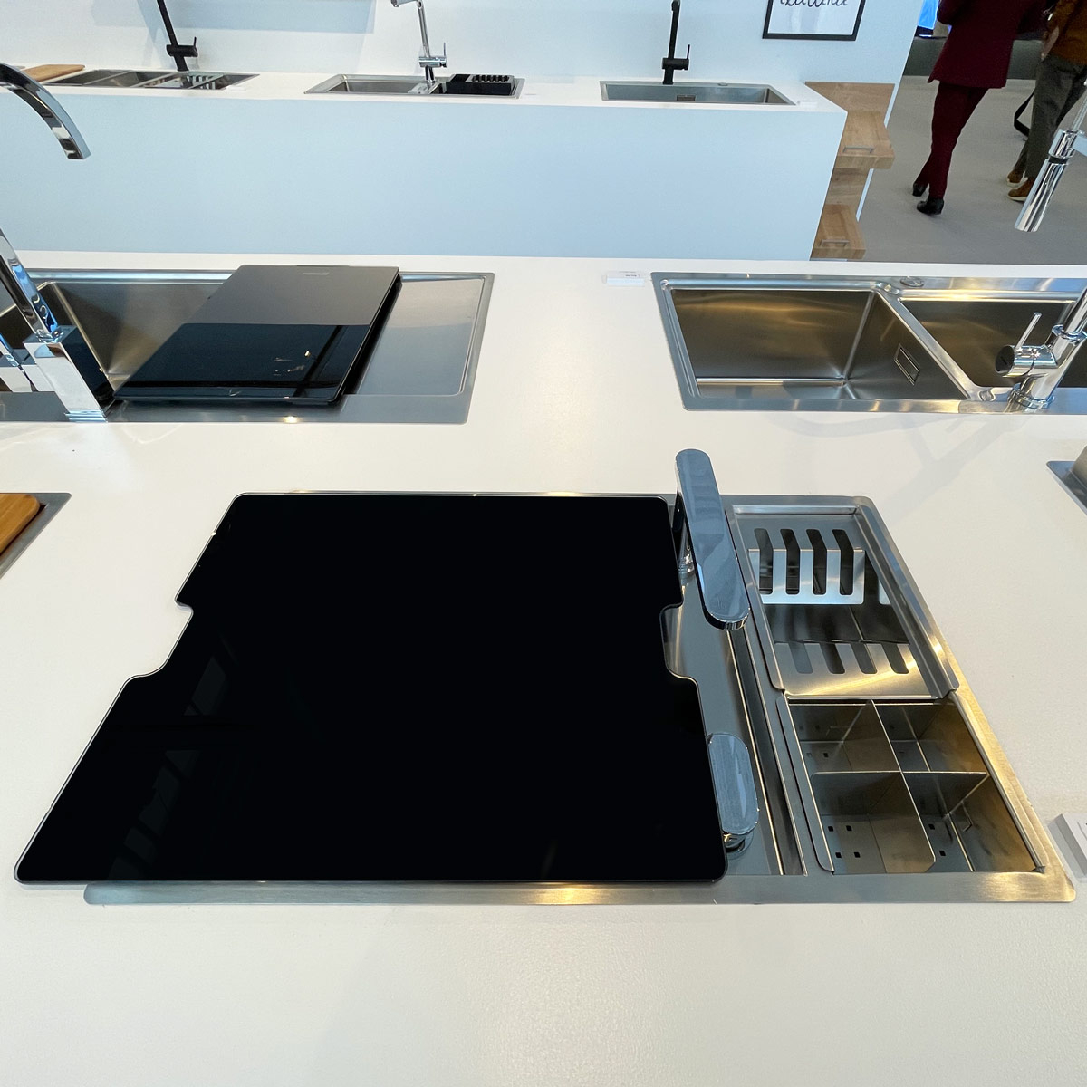 Chiuveta prezinta o margine speciala coborata sub nivelul buzei de sus a chiuvetei, pe care se monteaza bateria telescopica. Deasupra bateriei, pe marginea principala a cuvei se pot folosi mai multe accesorii de bucatarie printre care si tocatorul de sticla temperizata neagra inclus in setul prezentat aici. Acest tocator poate fi folosit fie ca si tocator pentru legume fie ca si capac al chiuvetei, caz in care chiuveta pare ascunsa in blat, mai putin partea de scurgator Mini Exclusive 440 care ramane vizibila atunci cand tocatorul de sticla este instalat.