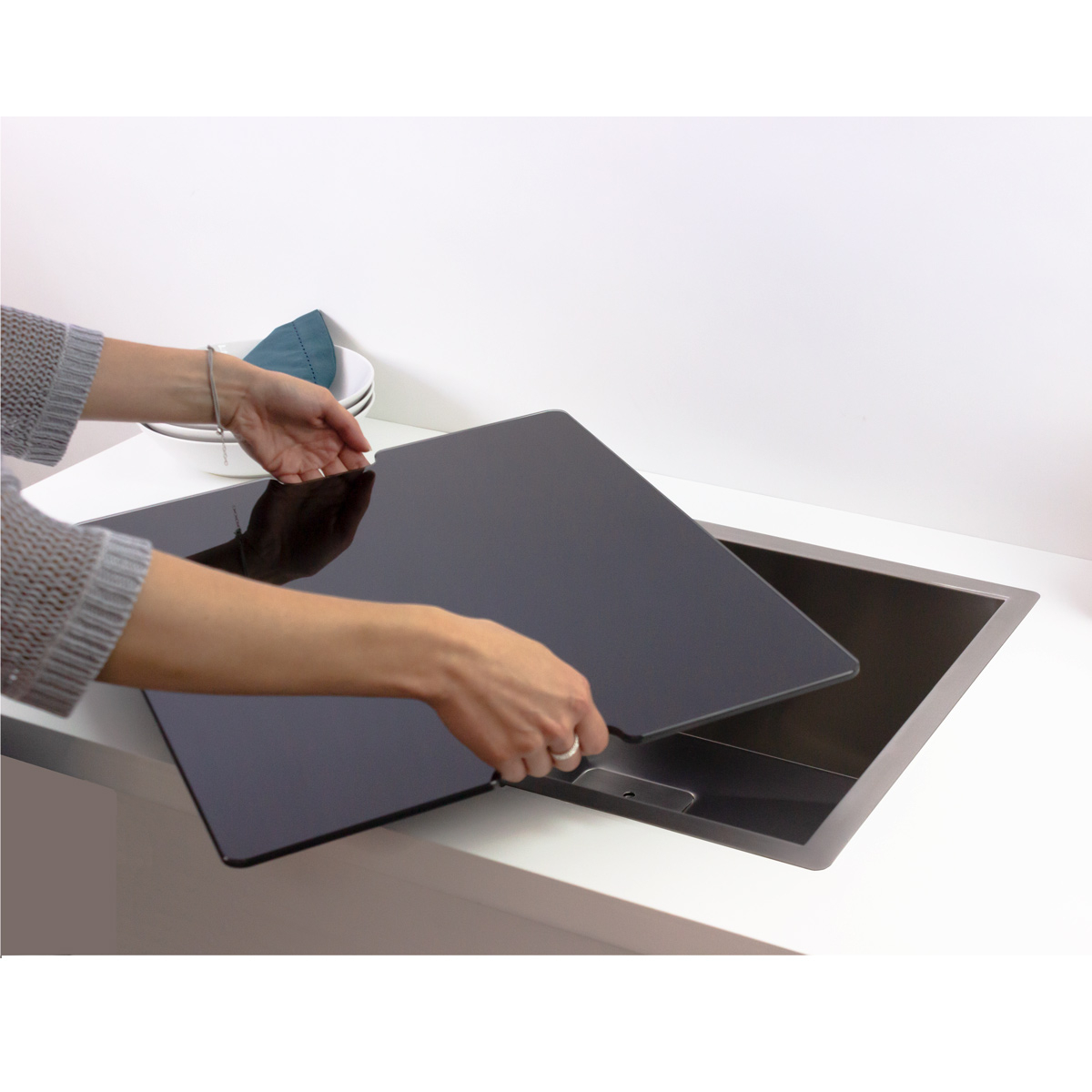 tocator din sticla temperizata neagra, personalizat pentru buza superioara a chiuvetei care poate sa fie folosit ca o zona de taiere/preparare a alimentelor, sau la nevoie poate ascunde cuva in blat folosind tocatorul din sticla pe post de capac. Tocatorul acopera doar partea de cuva a chiuvetei, nu si partea de picurator;