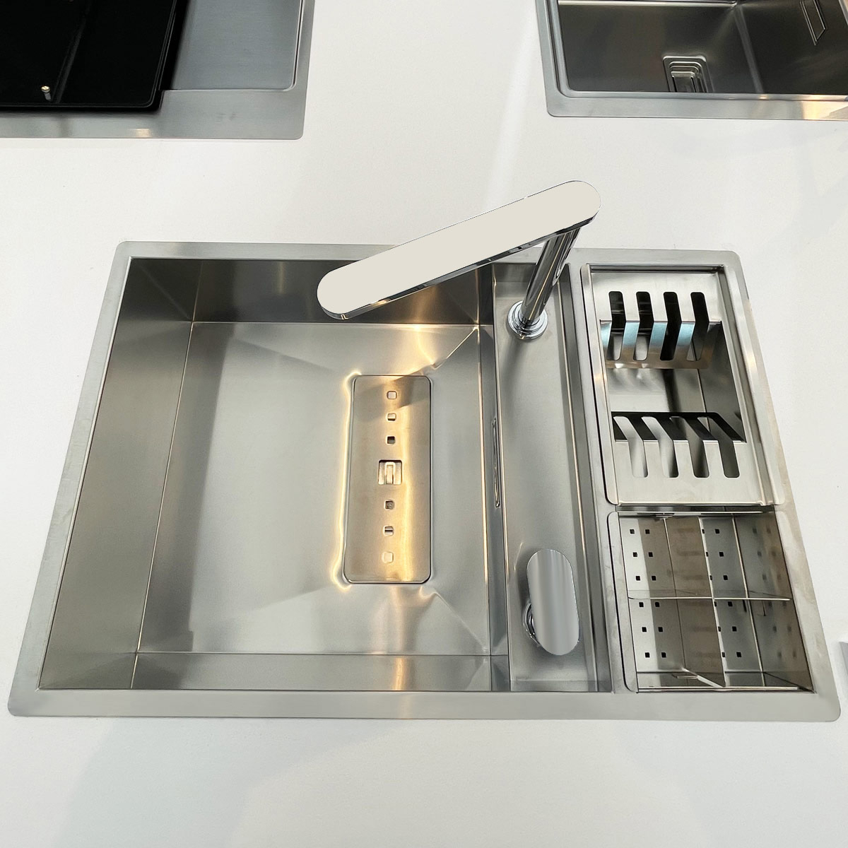 Chiuveta bucatarie inox CookingAid INVISIBLE 70 cu scurgator vase si baterie telescopica integrata, capac scurgere invizibil, tocator sticla temperizata + accesorii montaj