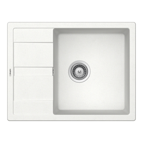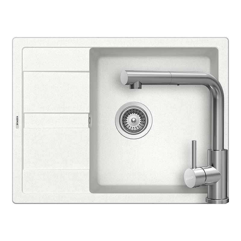 Chiuveta bucatarie Schock Ronda D-100L Cristalite Alpina 650 x 500 mm, compozit granit, reversibila, montare pe blat, alb cu montare pe blat si o cuva cu picurator este destinata adaptarii corpurilor de chiuveta de minim 50 cm. Chiuveta este reversibila, gaura pentru baterie este prefrezata si se face prin lovire, potrivit instructiunilor de montaj incluse in pachet sau cu ajutorul carotei diamantata disponibila contra cost. Chiuveta este realizata din material CRISTALITE® deosebit de rezistent - suprafata acestuit tip de material revolutionar este de aproape trei ori mai dura decat roca de granit, ceea ce inseamna si rezistenta sporita la socuri. In plus, suprafata CRISTALITE® include tehnologia SCHOCK proHygienic21, care asigura protectie pentru intreaga dvs. familie, atunci cand pregatiti alimentele, dar si facilitate la intretinere si curatare. Dimensiunile reduse si cuva mai mult decat generoasa sunt caracteristicile ce promoveaza acest model de chiuveta, ideal pentru bucatariile mici tipice garsonierelor sau apartamentelor din oras. In plus, pentru modernitate si eleganta suplimentare, chiuveta ofera posibilitatea de adaptare a unui tocator din sticla sau din bambus. Pachetul include garnitura de scurgere, ventil cos, sifon si cleme.