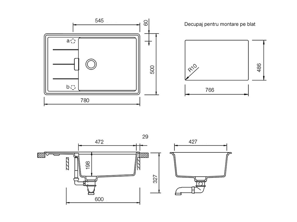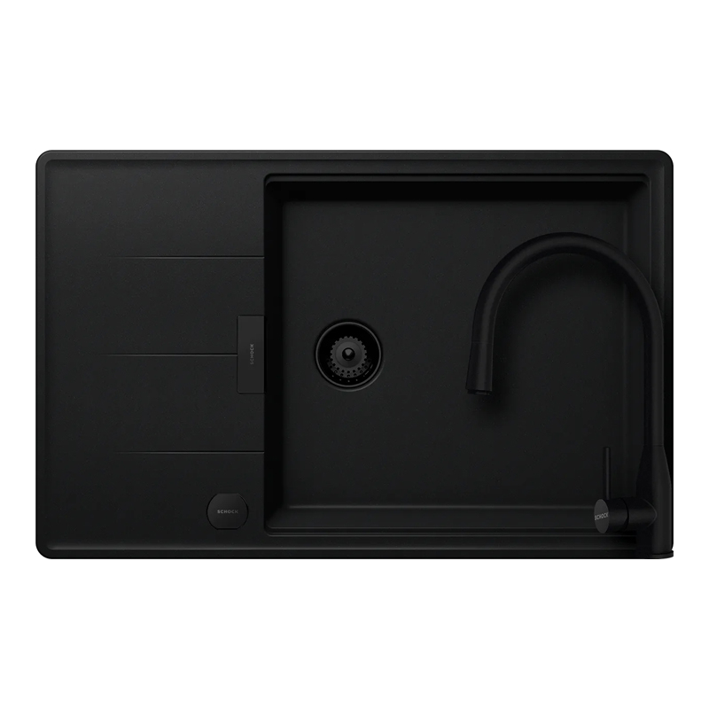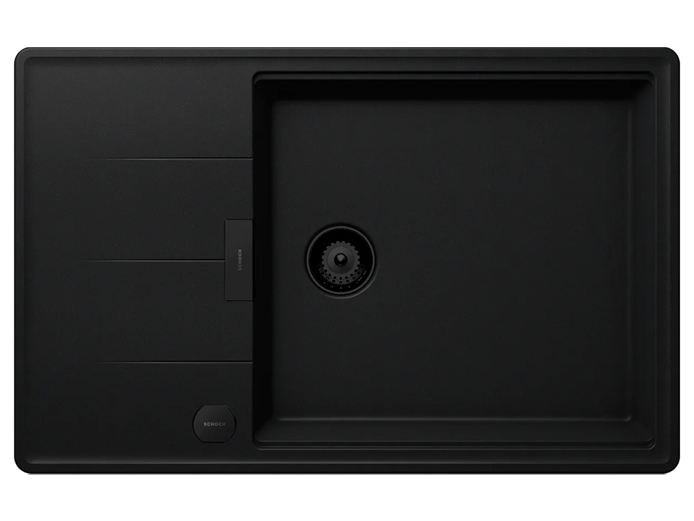 Chiuveta bucatarie Schock Tia D-100LS Cristadur Puro 780 x 500 mm cu sifon automat, granit, reversibila, montare pe blat, negru intens - modelul cu 1 cuva si picurator este potrivit pentru corpuri de chiuveta de minimum 60 cm. TIA D-100LS este statia ideala de pregatit alimentele pentru bucatariile mici. Un accesoriu suplimentar - o margine de care pot fi agatate diverse accesorii pentru cuva - se va dovedi extrem de utila si eficienta. In plus, exista nenumarate accesorii ce pot fi achizitionate separat, precum tocatoare, tavi si strecuratoare, toate menite sa economiseasca timp pretios si sa transforme zona chiuvetei intr-un mic colt de rai pentru cei pasionati de arta culinara. Chiuveta este realizata din material CRISTADUR® cu efect de respingere a murdariei, fara miros (lasa suprafata fara mirosuri), rezistent la caldura pana la 180°C, rezistent la decolorare, usor de curatat, rezistent la impact, sigur in contact cu alimentele si extrem de durabil. Gaura pentru baterie este prefrezata si se face cu ajutorul carotei inclusa in coletul de livrare. Pachetul include garnitura de scurgere, ventil cos, sifon, cleme si  Carota Diamantata.