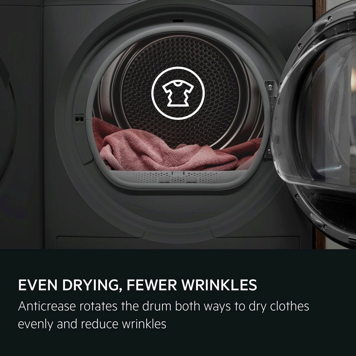Tehnologia Anticrease a uscătorului de rufe permite rotirea tamburului pe două direcții, ceea ce ajută la uscarea uniformă a hainelor și la reducerea cutelor și pliurilor.